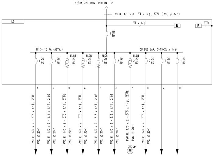 配電盤的上、下游關係,該配電盤是承繼上一層的哪一個配電盤,如上圖中說明該配電盤的上一層盤名為L2,以PVC.W, 1/C x 3 - 14, 5.5E(PVC, ∅ 35-1),3條14㎜2的PVC電線及1條5.5㎜2的PVC接地電線穿入∅ 35㎜的PVC導線管連接L2盤與L3 盤。