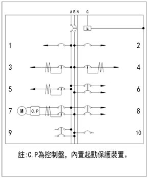 第7分路之C.P為控制盤,其盤內須附MCCB或ELCB & MS 保護開關。220V 15HP(含)以上之起動控制盤,其盤內須附MCCB & Y-Δ 起動電磁開關;380V 50HP(含)以上之起動控制盤,其盤內須附MCCB & Y-Δ 起動電磁開關。