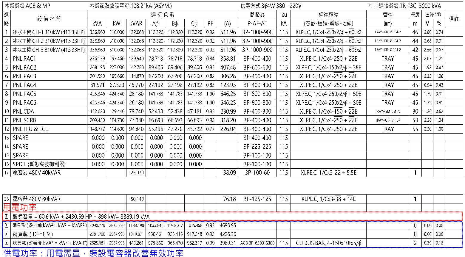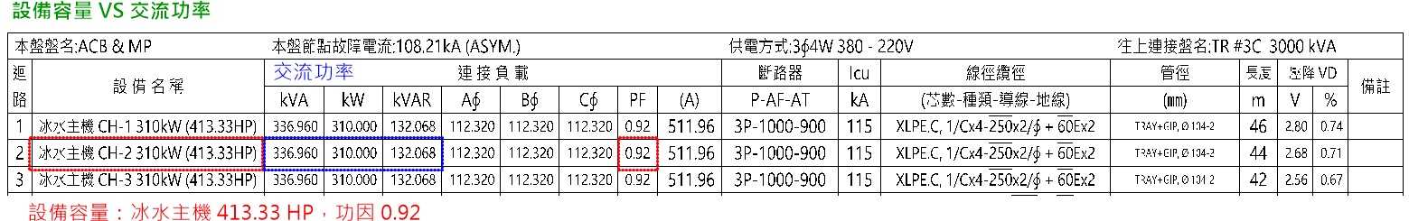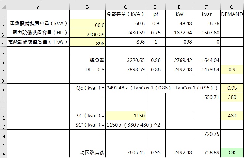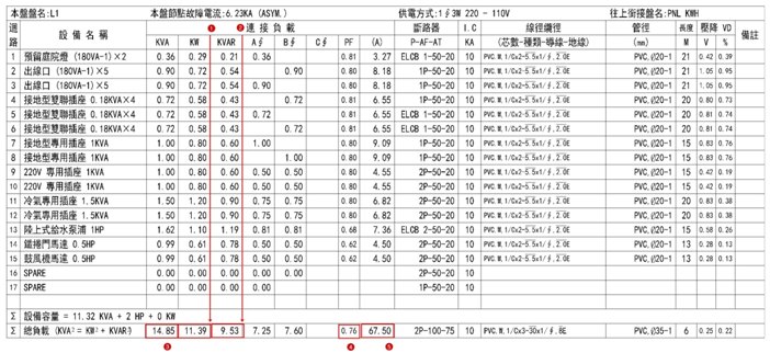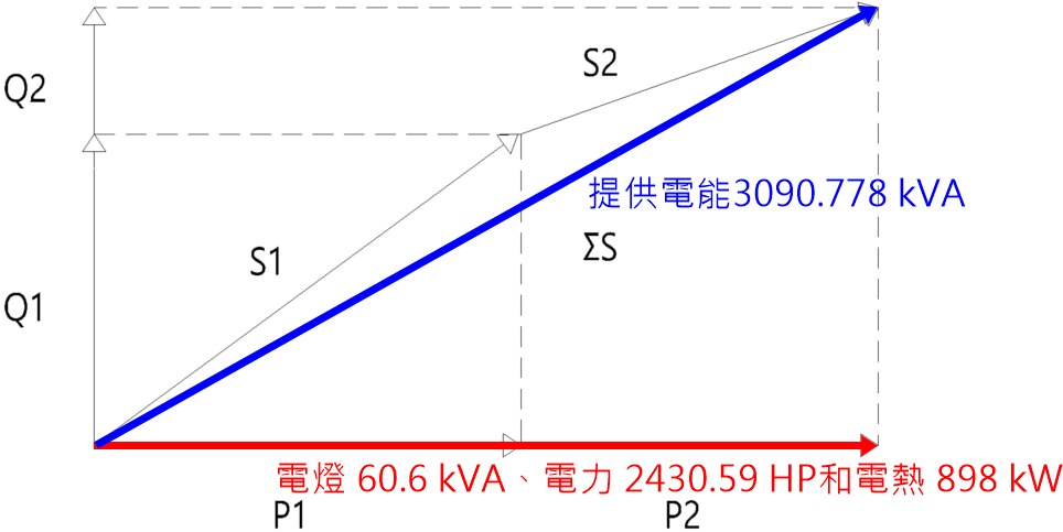 電燈 60.6 kVA、電力 2430.59 HP和電熱 898 kW為設備裝置容量(不會因系統設計而改變),而需提供多少電能則要視這些設備的功因與效率而定(相關計算時,若不知道實際功因,請指定合理的值,例如 0.8,並須維持一致性,例如計算負載電流和分路電壓降時,需要使用同一個功因值),將設備裝置容量轉換成交流負載 2875.55 kW + j 1133.19 kvar,可知需提供電能3090.778 kVA。考慮用電需量DF = 0.9,並將功因改善至 0.95,經計算提供電能為 2625.681 kVA。