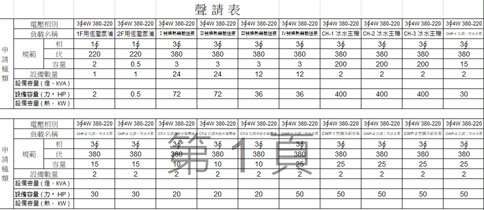 1. 台電登記設備容量:燈 + 力 + 熱 = kVA