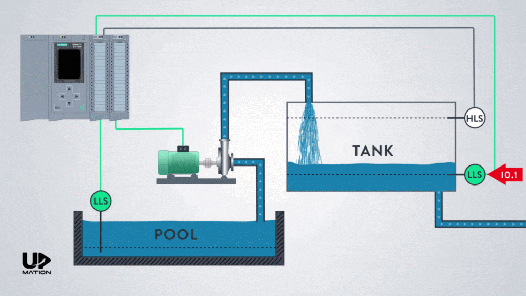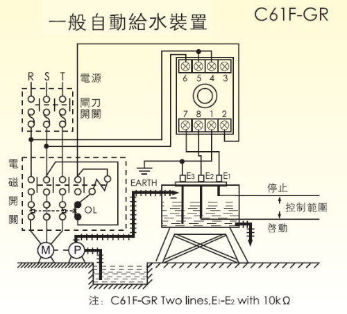 - FS(上下)、FS(上)和FS(下):FS(液位開關)檢測與監控液面之高低,使上限開關和下限開關動作控制MC之閉合或啟斷,達到給水和排水之目的。