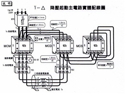 - Y - Δ:一般較大馬力之三相感應馬達之起動採用 Y-Δ,達到降壓啟動之目的,220 V 供電 15HP 以上,以及 380 V 供電 50HP 以上須採「 Y - Δ」啟動。