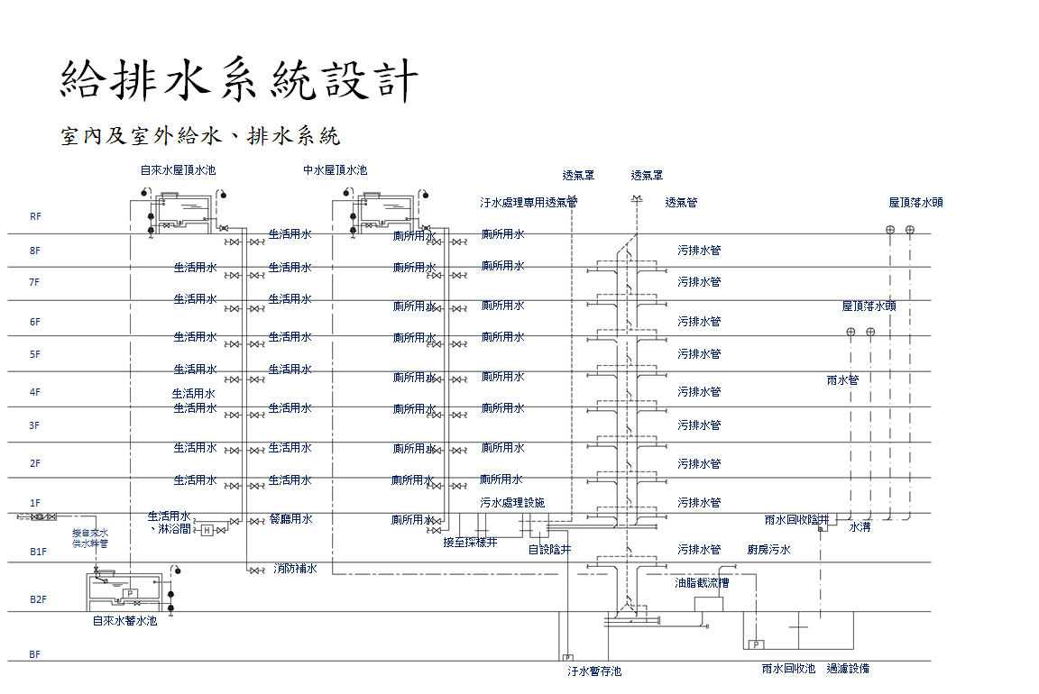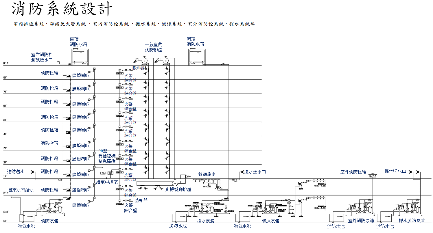 消防設備:撒水泵浦、緊急電梯、排煙機、消防泵浦和泡沫泵浦等。