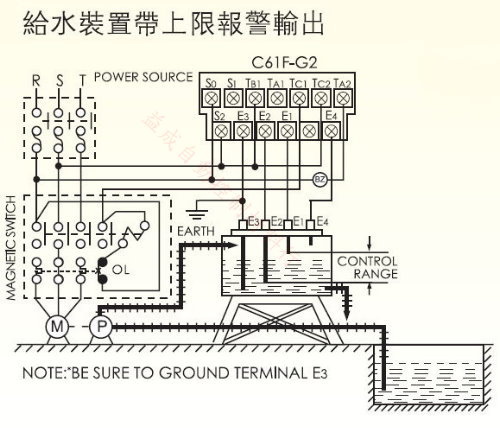 - 給水(揚水、清水)交替控制盤,低水位啟動給水,高水位關閉