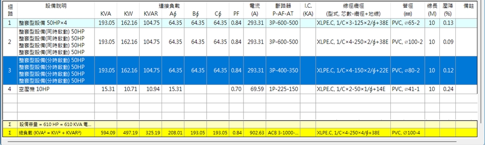 其中IB:分路保護器之額定電流,C:啟動電流乘率, 一般取1.5- 2.5倍,If:電動機之全載電流,需量率=最大需量/設備容量﹙若不能確定時以1表示﹚