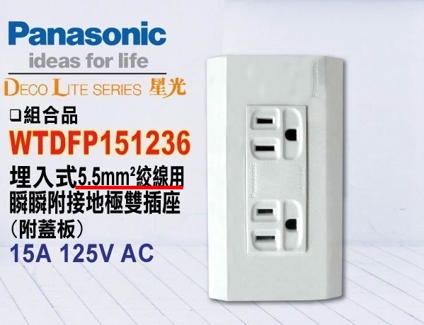 - 國際牌星光系列WTDFP151236接地雙插座,適用5.5mm²絞線用