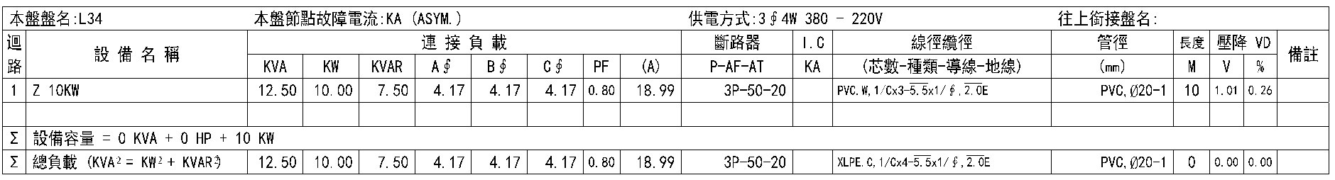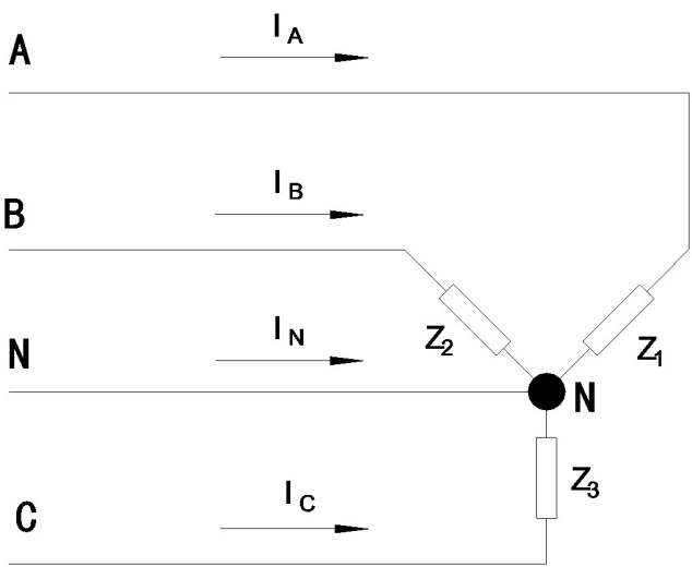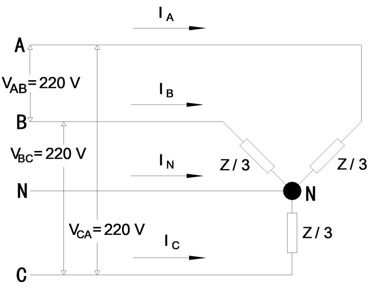 IL =(10 KW / 0.8)/(√3 * 0.38 KV)= 18.99 A(由A、B、C分別經Z / 3流向N)