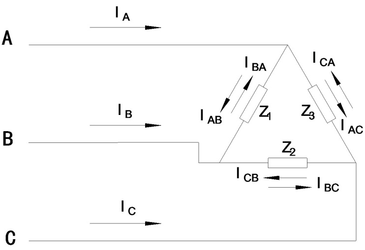 單相負載相電流 IAB = P1∮Z1 /(cosθ1 * VAB) IAC = P1∮Z3 /(cosθ3 * VAC)