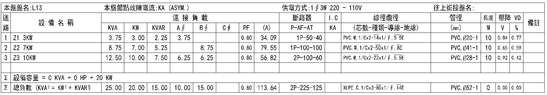 一旦得知負載電流後,即可據此選用斷路器規格和管徑線徑,同時計算壓降(需指定線長)。當採三相交流電源時,負載電流可以降得更低(3∮ 送電總量為1∮ 的√3倍),可節省線路和設備的設置費用,同時減少線路損失。