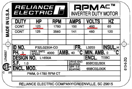 某三相馬達銘牌標示如後:動力輸出125 HP,額定電壓V= 460 V,電流I = 150 A,假設其效率 η = 1,試求此馬達的功率因數?