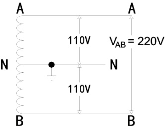 一組線圈,中間抽頭,自兩端及連接的中點,拉出三條線(A、B、N)或(L1、L2、N)。