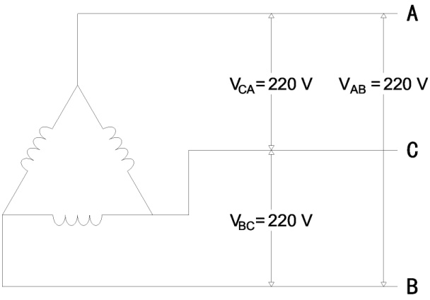 - 三相三線式 220 V 為 Δ 結線 B相接地,應為三相動力專用,B相接於配電盤接地銅排,對地電壓 0V,A相和C相對地電壓為220V。若要接單相設備,可接於CA相,電燈建議用AB或BC相(照明迴路一定要包含一條已經被接地之中性線)